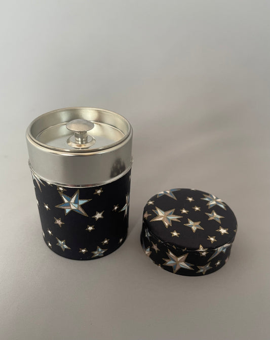 友禅和紙お茶缶 S (茶葉40 g用) ORIGAMI STAR ダークネイビー/金糸目