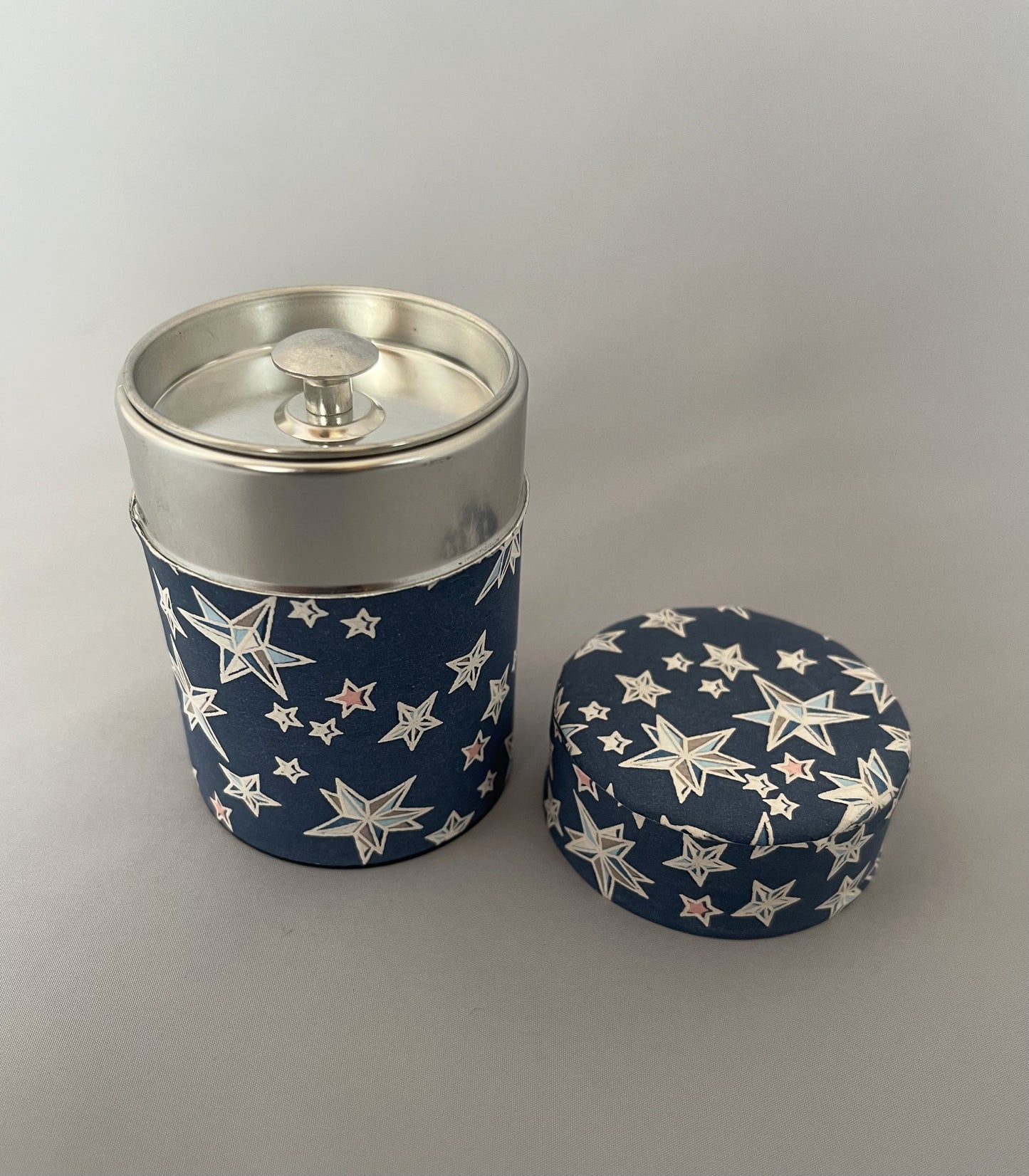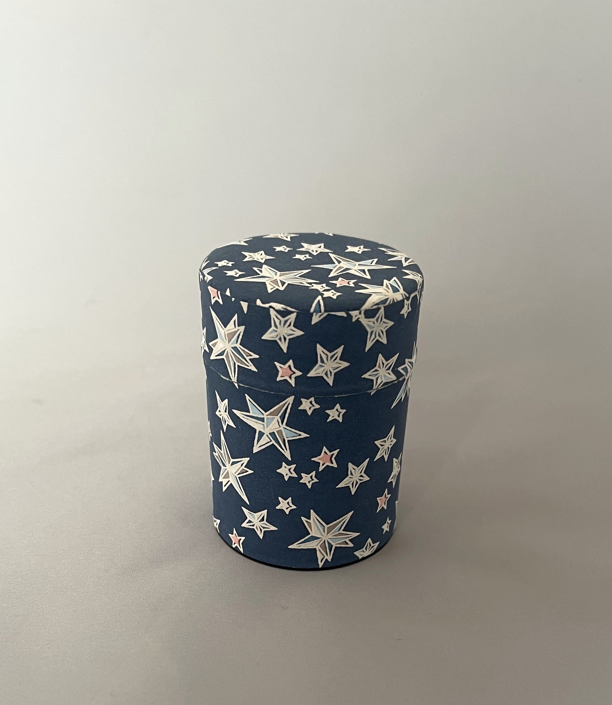 友禅和紙お茶缶 S (茶葉40 g用) ORIGAMI STAR ネイビー ピンク星入り/白糸目